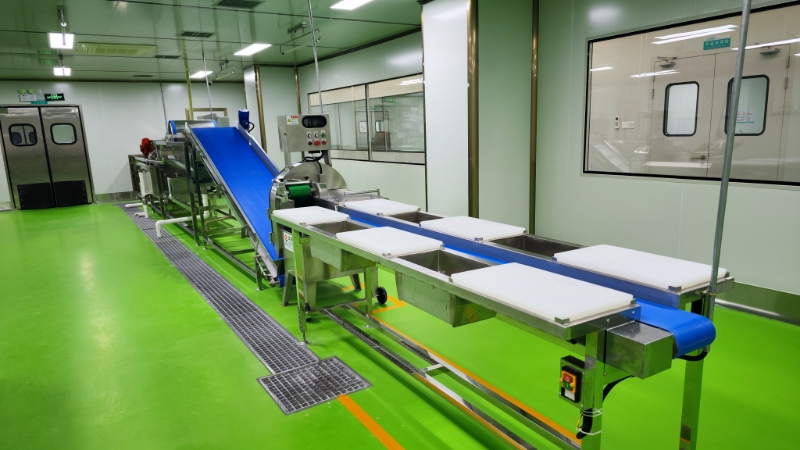 全自动化叶菜类、根茎类清洗加工生产线,运用净化水在水温2℃下重复清洗,应用强力鼓泡、水流冲浪、爬坡翻转、高压喷淋、浸泡清洗、脱皮机去皮除渣,确保蔬菜彻底清洗干净的同时,保障蔬菜营养不流失以及食品安全的有效可控。